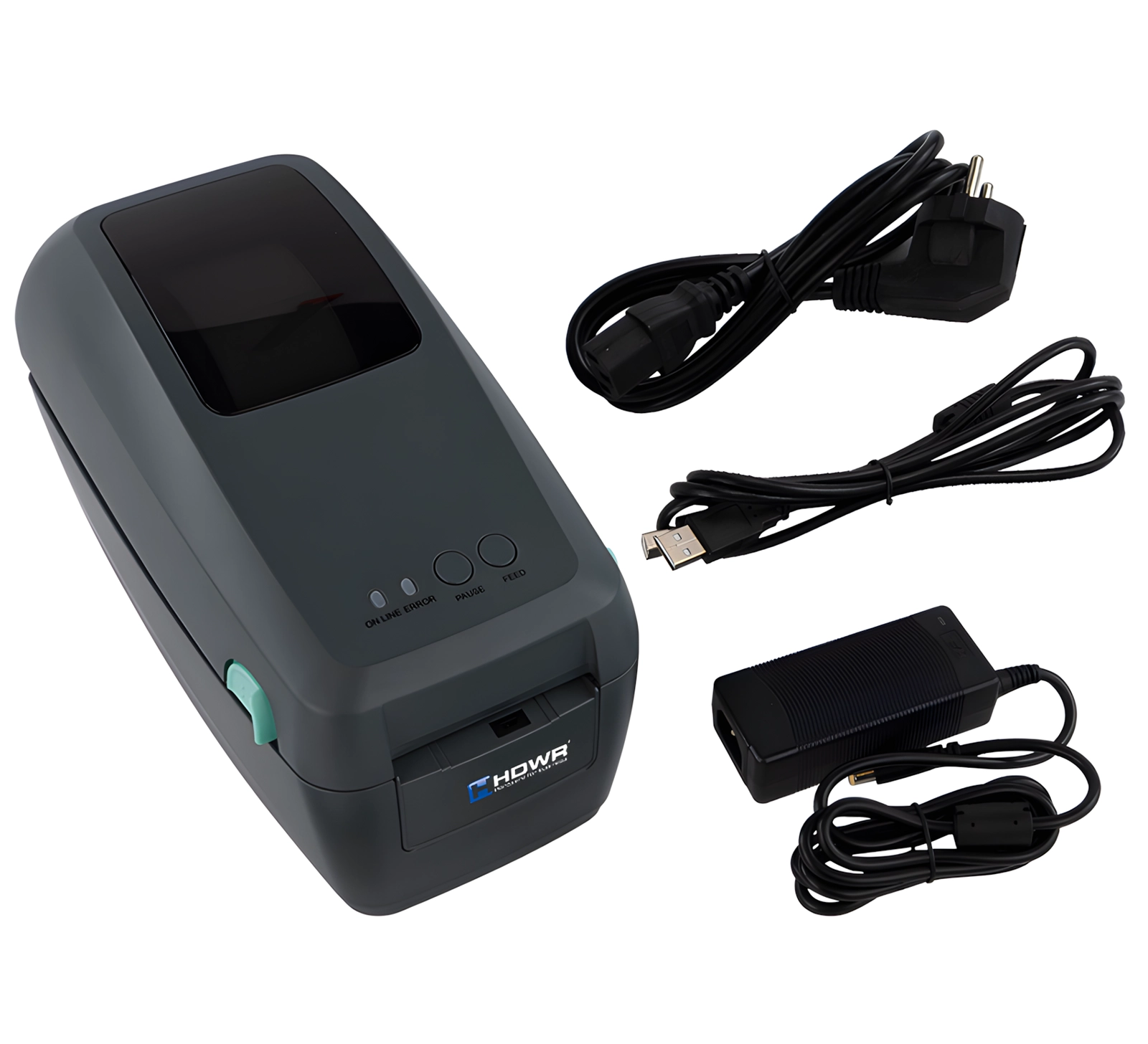 Drukarka etykiet, przewód USB-B, przewód zasilający, wrzeciono na rolkę, rolka testowa