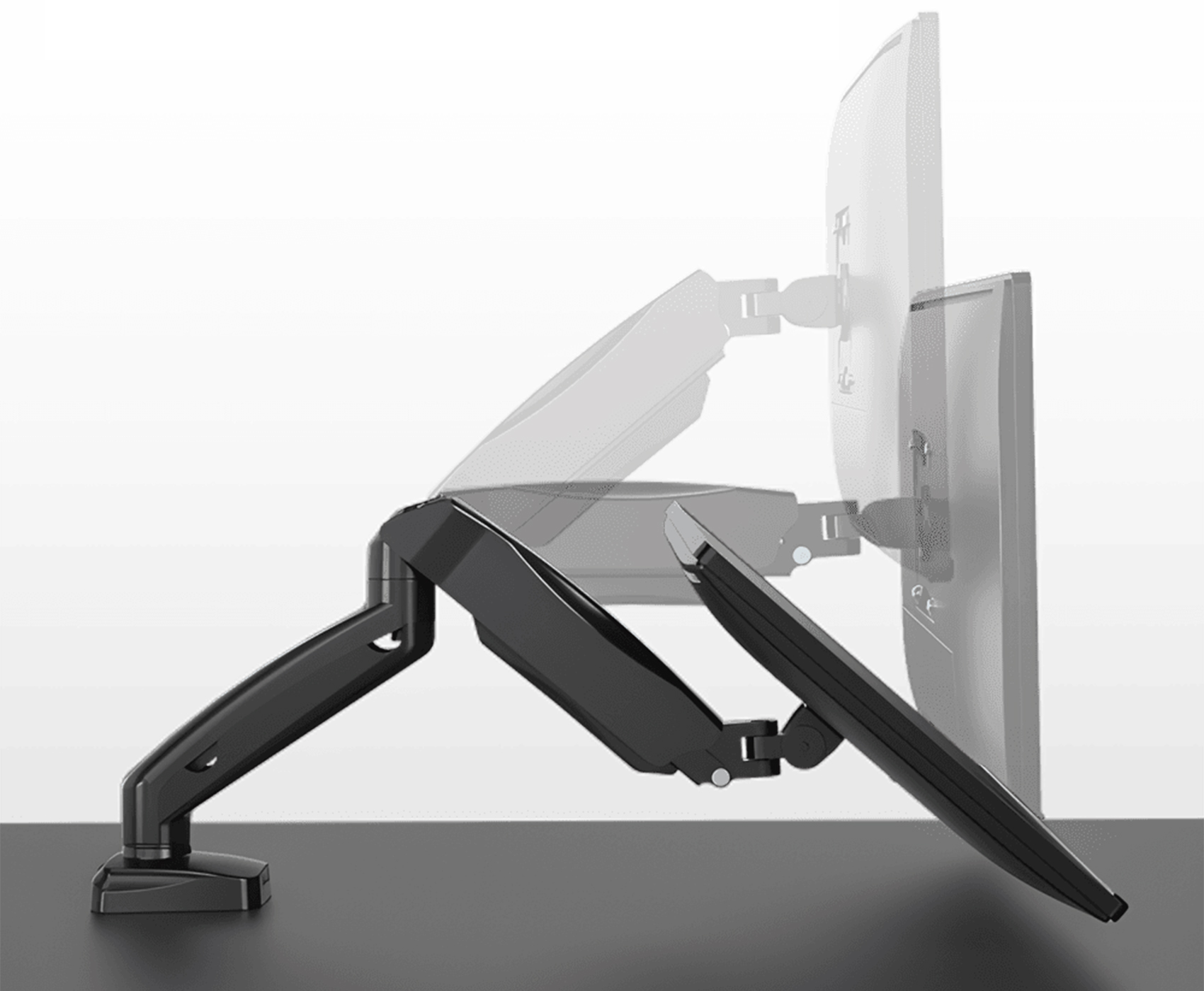 Ramię uchwytu wspomagane sprężyną mechaniczną umożliwia płynne i precyzyjne ustawienie monitora na dogodnej wysokości. Uchwyt pozwala na obrót ekranu o 180 stopni, regulację kąta pochylenia w zakresie +90° do -45° oraz ustawienie monitora w pozycji pionowej poprzez obrót ramienia o 90 stopni. Takie możliwości ułatwiają dopasowanie monitora do indywidualnych potrzeb użytkownika.
