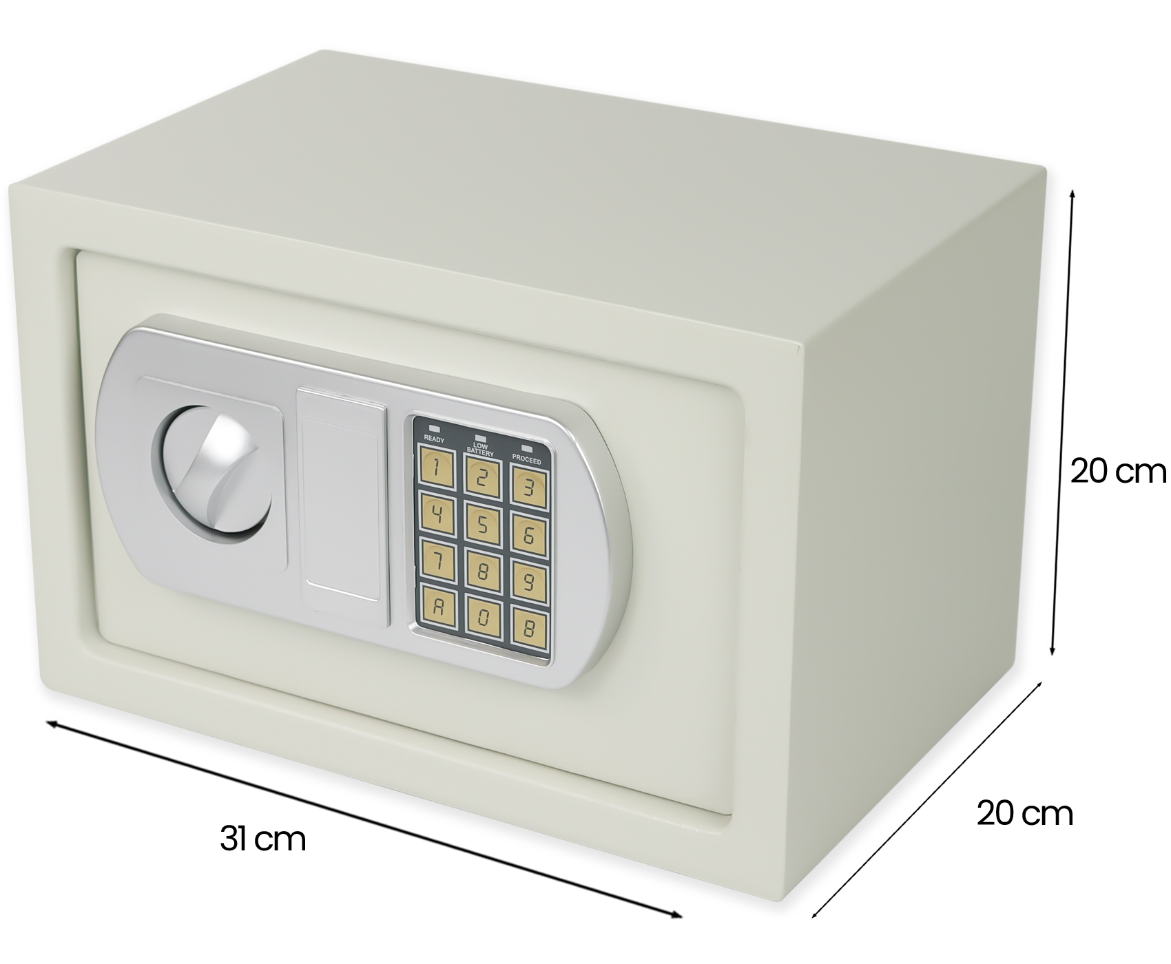 Sejf na kod SecureBox-30 to funkcjonalne i bezpieczne rozwiązanie idealne do biura, domu czy hotelu. Wykonany z trwałej stali, posiada drzwi o grubości 2 mm oraz solidną obudowę o grubości 4 mm, co zapewnia wysoką odporność na uszkodzenia mechaniczne i próby włamania. Dzięki zewnętrznym wymiarom 20 × 31 × 20 cm sejf jest pojemny, a jednocześnie kompaktowy, dzięki czemu bez problemu zmieści się w szafie, na regale lub pod biurkiem.