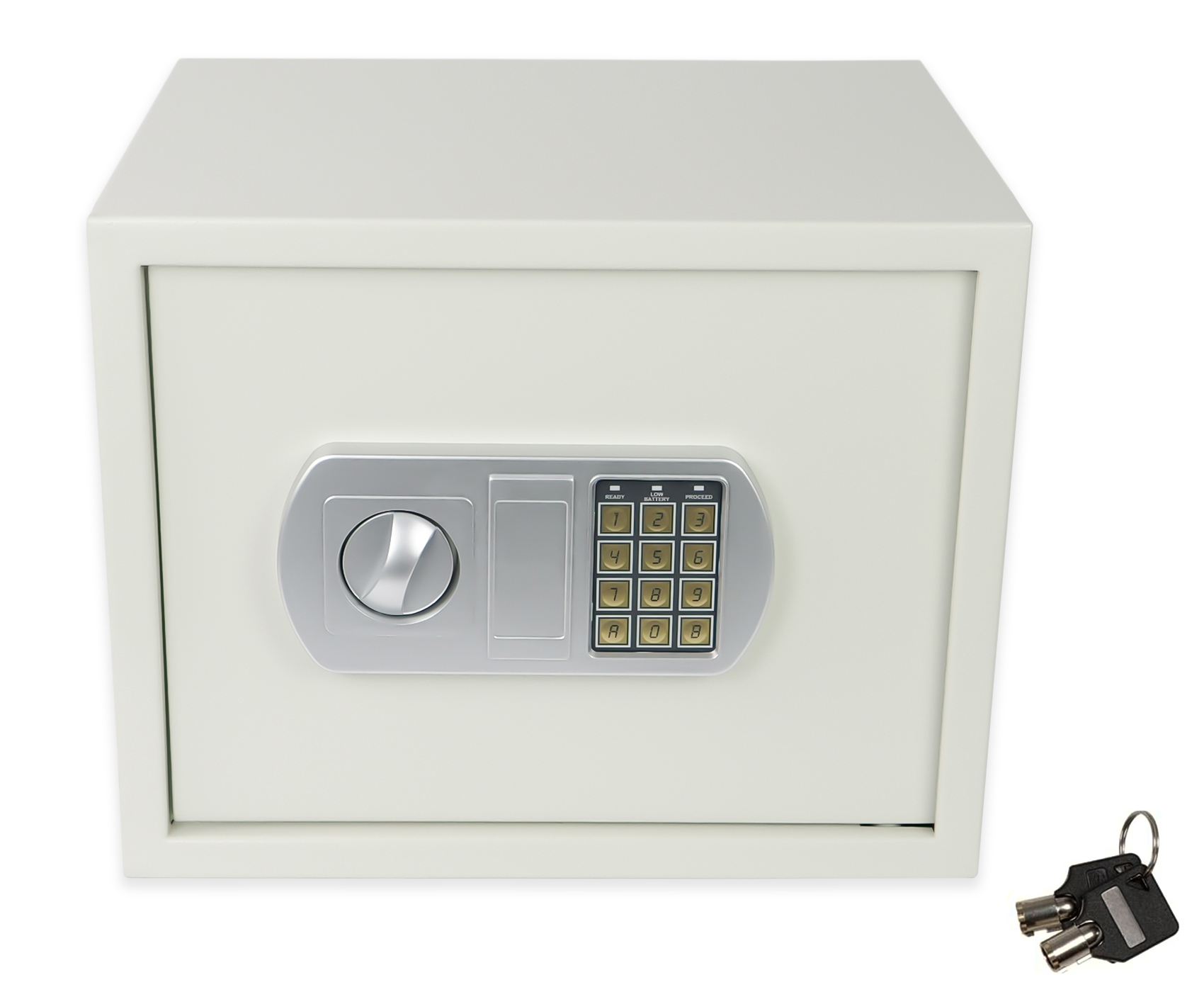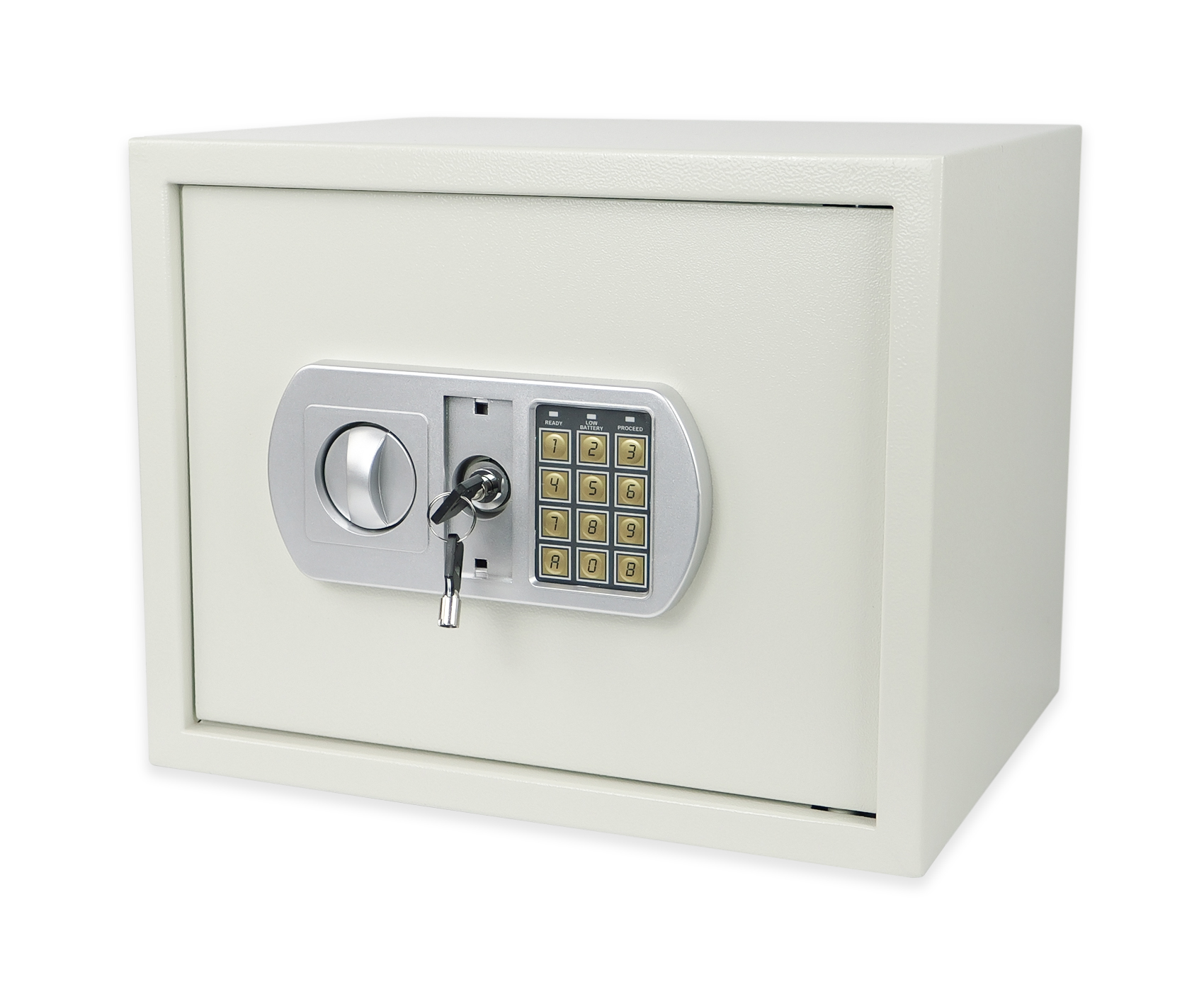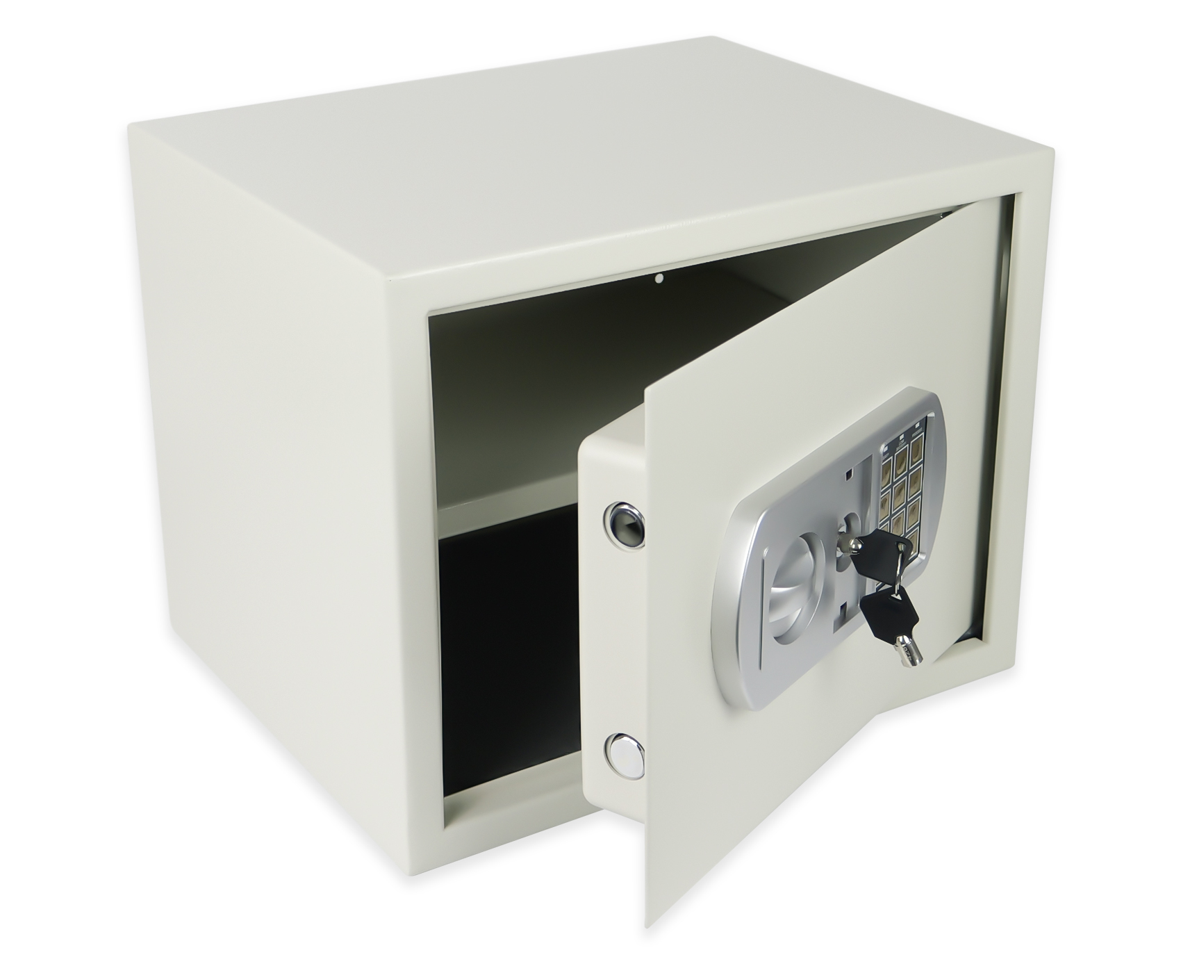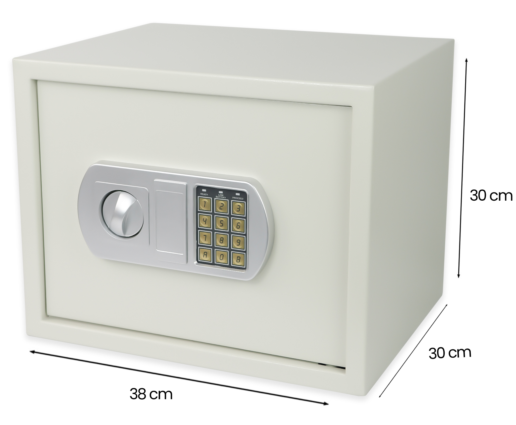 Model SecureBox-50 oferuje dwustopniowy system zabezpieczeń — sejf można otworzyć zarówno za pomocą elektronicznego kodu PIN (od 3 do 8 cyfr), jak i klucza awaryjnego. Panel elektroniczny zasilany jest 4 bateriami AA 1,5 V (brak w zestawie). W razie potrzeby sejf można trwale zamontować do ściany lub podłogi — posiada otwory montażowe oraz niezbędne elementy w zestawie, co znacząco zwiększa poziom bezpieczeństwa. Zewnętrzne wymiary sejfu to 38 × 30 × 30 cm, dzięki czemu znajdzie swoje miejsce zarówno w biurze, jak i w domowym wnętrzu.