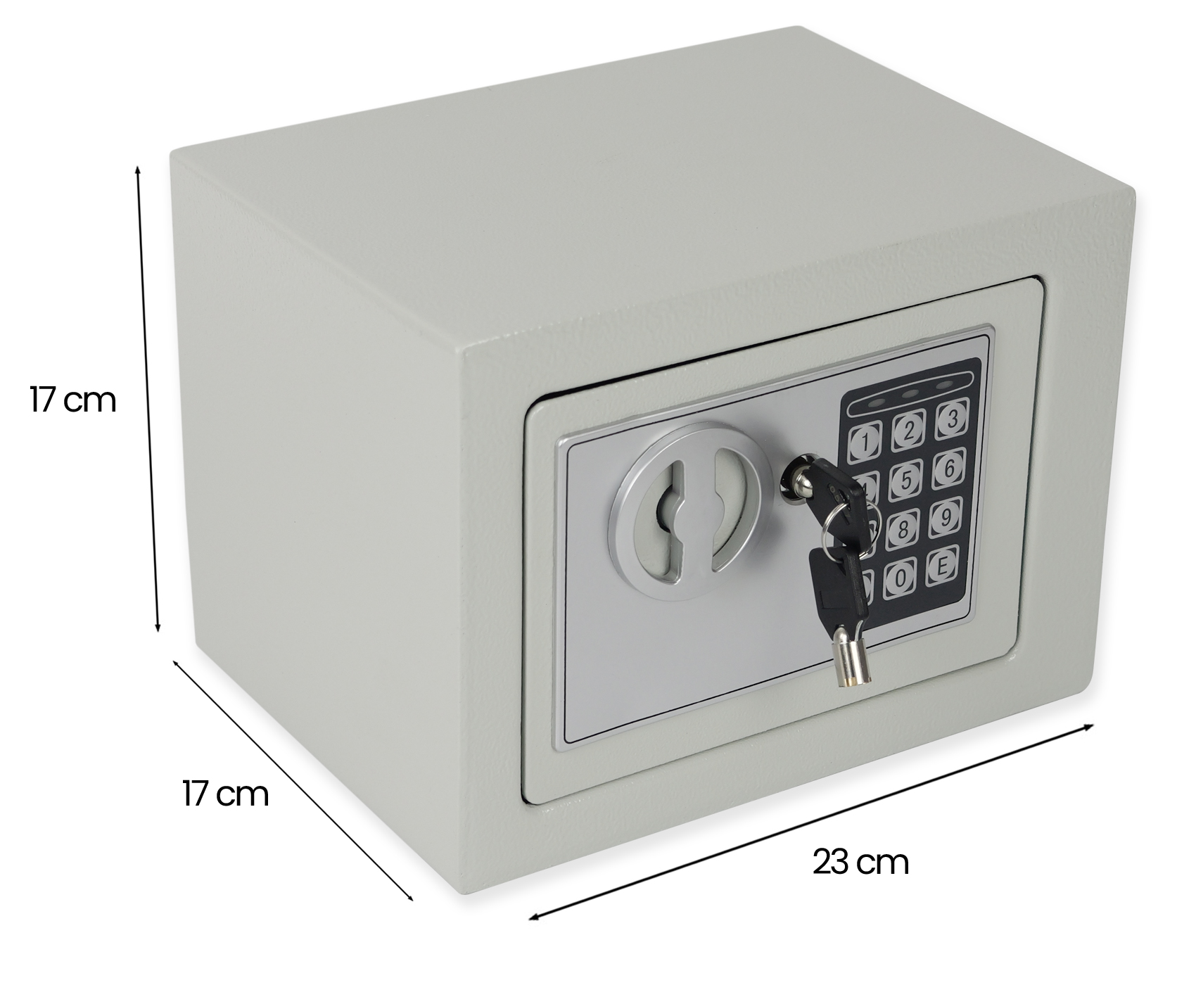 Sejf wyposażono w mechaniczny zamek na kluczyk oraz elektroniczny zamek na kod, co pozwala na wygodne i bezpieczne korzystanie z obu form zabezpieczeń. Panel elektroniczny wymaga zasilania bateriami 4 × AA 1,5V (brak w zestawie), dzięki czemu sejf działa niezależnie od zewnętrznego źródła prądu. Wymiary zewnętrzne 23 × 17 × 17 cm umożliwiają umieszczenie sejfu na półce, w szafie lub w innym dyskretnym miejscu. Dodatkowo model posiada otwory montażowe oraz śruby w zestawie, dzięki czemu można go trwale przymocować do ściany lub podłogi, zwiększając poziom zabezpieczenia. Model SecureBox-20 to doskonały wybór dla osób, które cenią bezpieczeństwo swoich wartościowych rzeczy i chcą mieć je zawsze pod ręką.