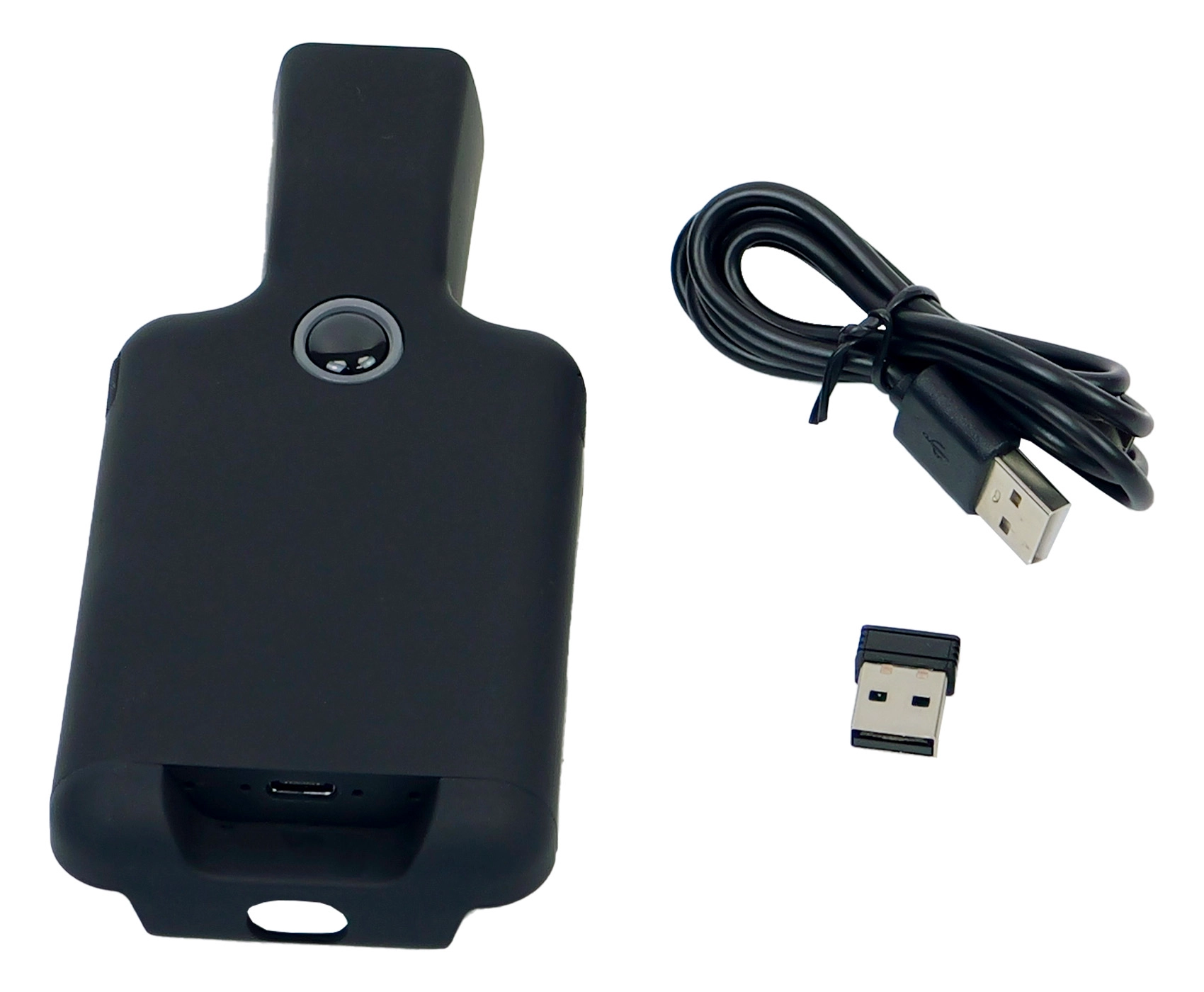 Bezprzewodowy czytnik kodów QR, przewód USB, przewód ze złączem USB-C, odbiornik USB, instrukcja obsługi w formie papierowej w języku angielskim.