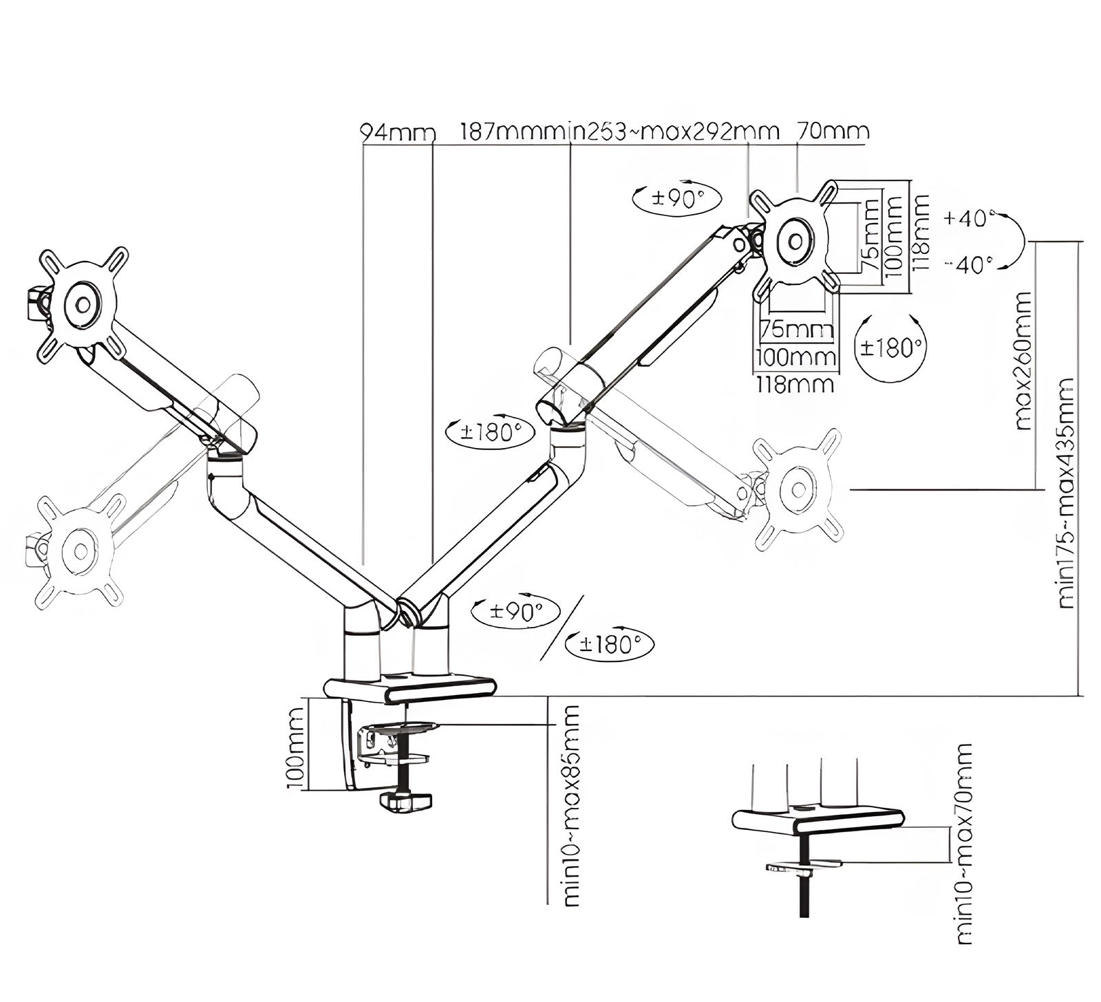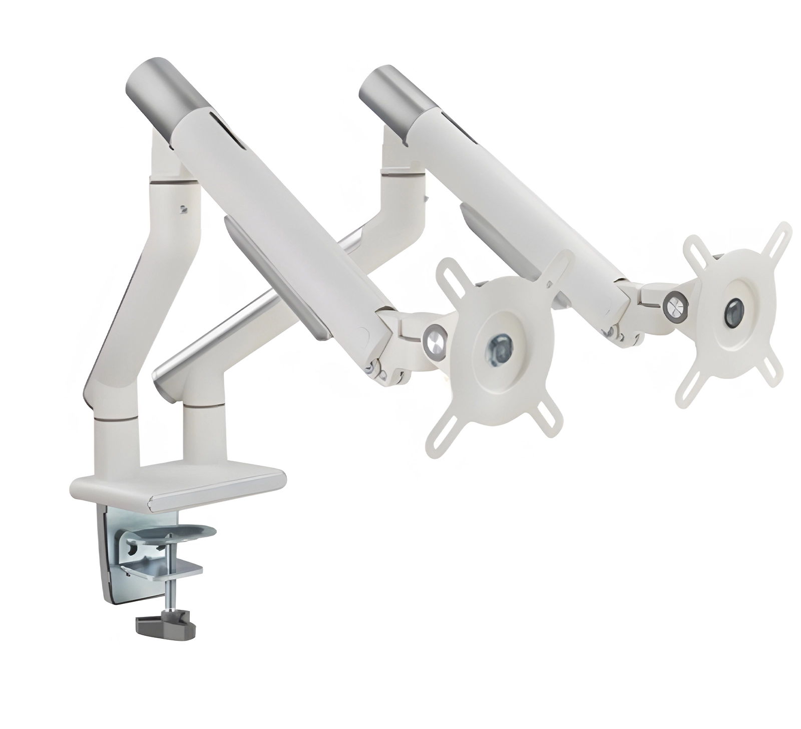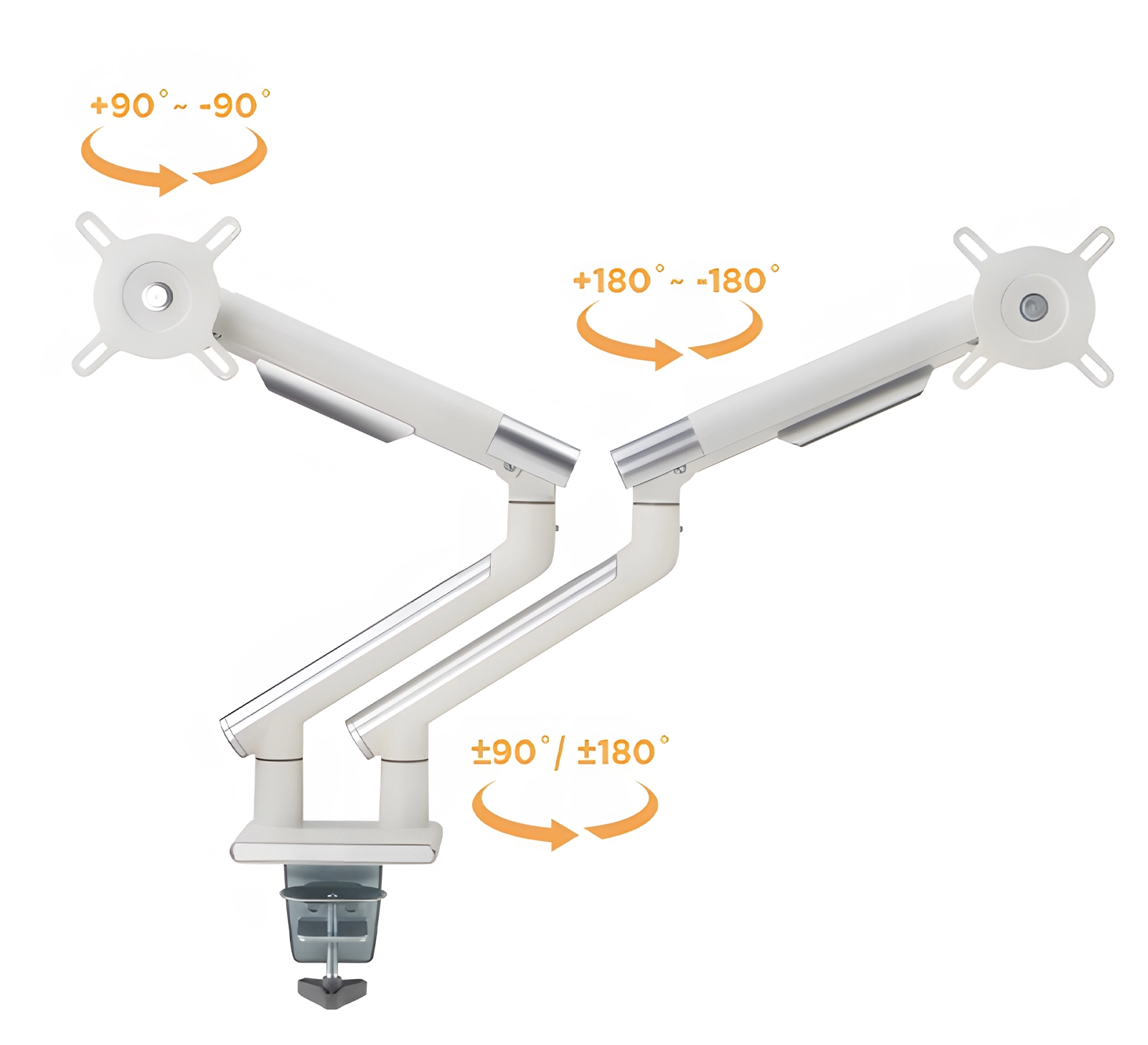 Sprężyna mechaniczna zamontowana w uchwycie umożliwia precyzyjne i wygodne ustawienie ramion w pożądanej pozycji. Ponadto, dzięki funkcji tilt monitor może zostać przekręcony o 90 stopni, tworząc w ten sposób ekran pionowy. Uchwyt biurkowy na 2 monitory pozwala na obracanie ramienia o 180 stopni, jak również pochylenie i odchylenie w zależności od potrzeb do 40 stopni.
