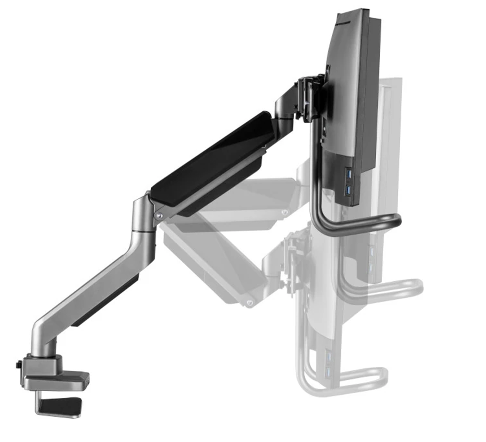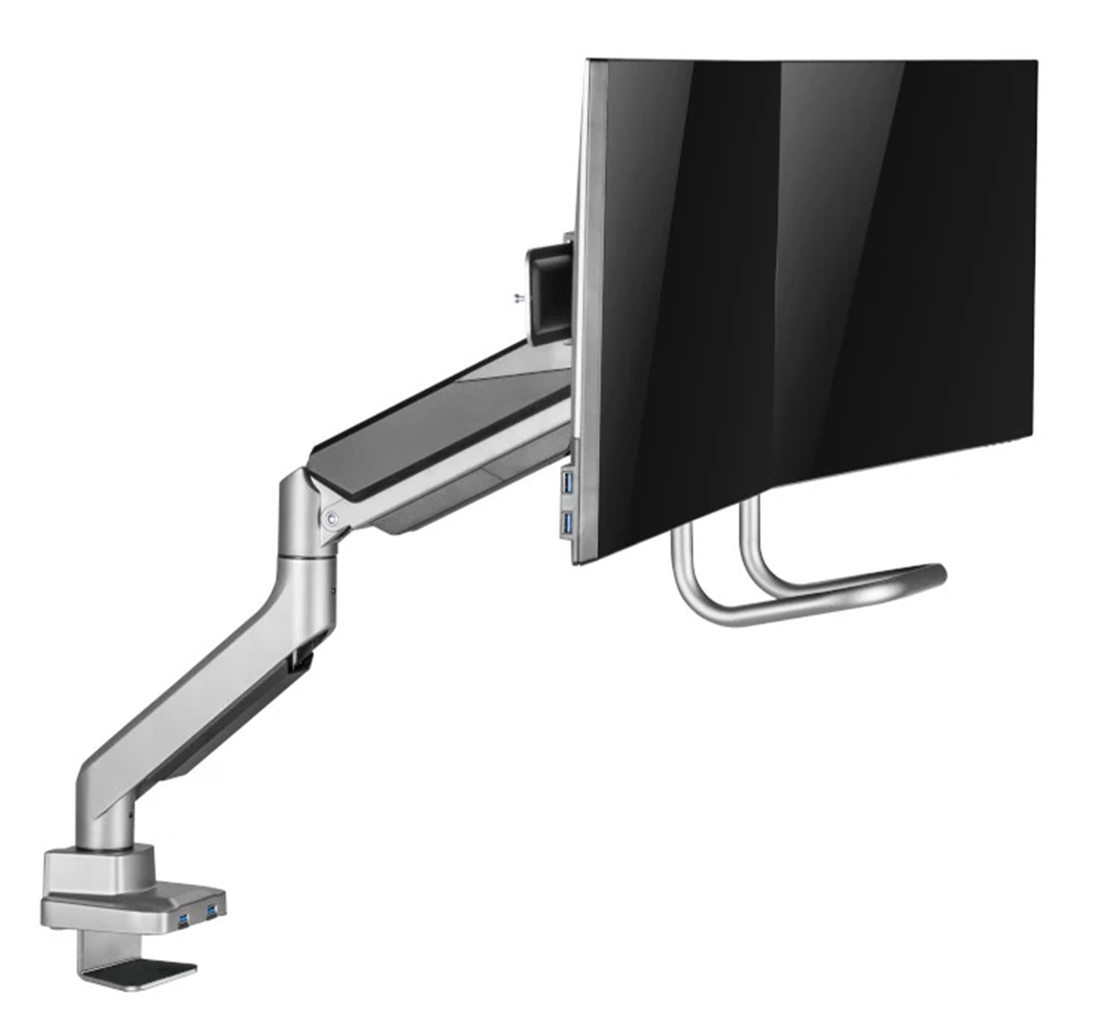 Ramiona uchwytu do monitora 32 cali wyposażono w sprężynę gazową, która umożliwia łatwe i precyzyjne ustawienie monitora w wybranej pozycji. Urządzenie pozwala na obrót monitora o 180 stopni. Model jest kompatybilny z większością monitorów dostępnych na rynku, dzięki otworom o wymiarach 75 x 75 mm i 100 x 100 mm w standardzie VESA. W podstawie uchwytu znajdują się dwa porty USB 3.0, które umożliwiają podłączenie zewnętrznych urządzeń do komputera.