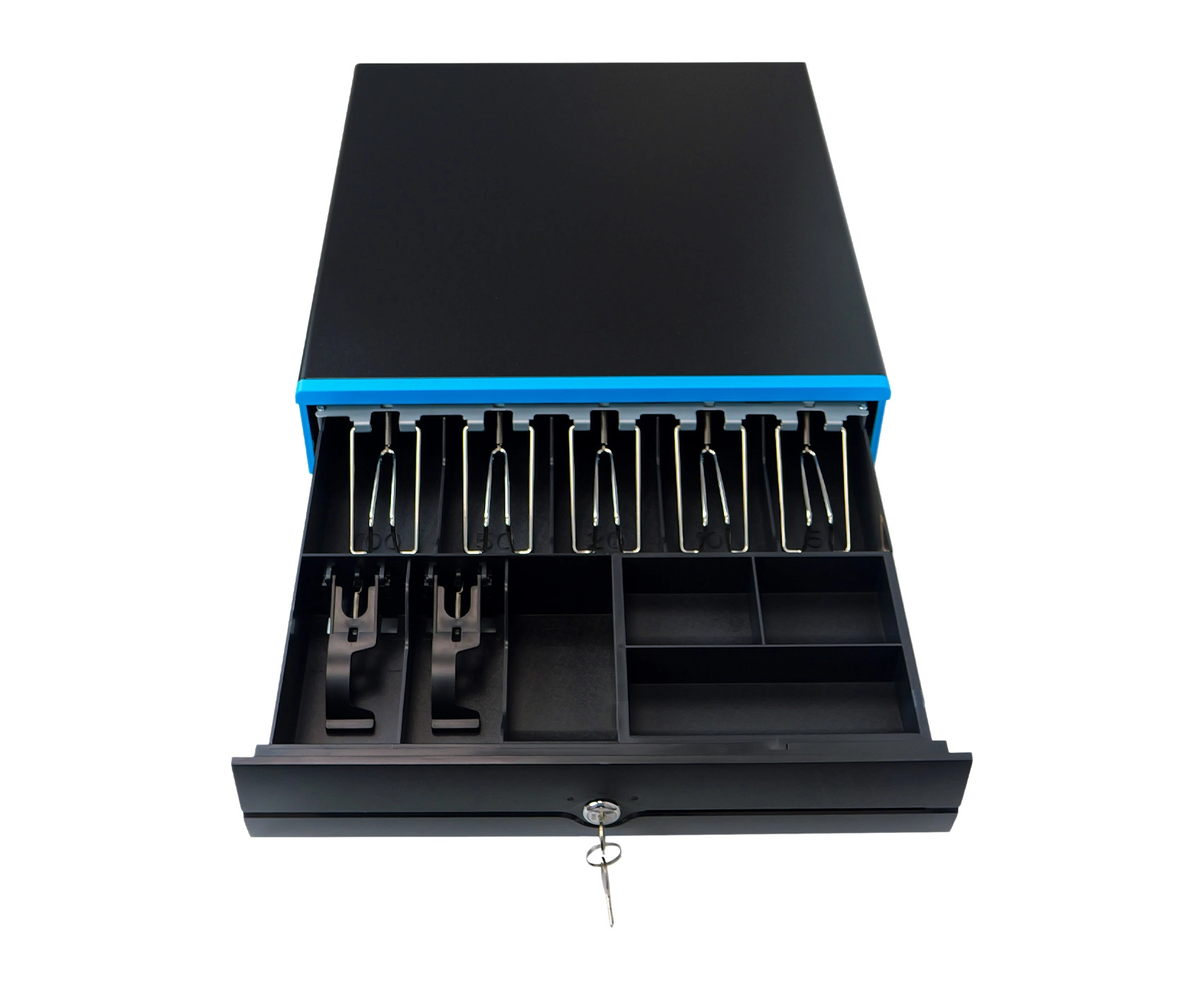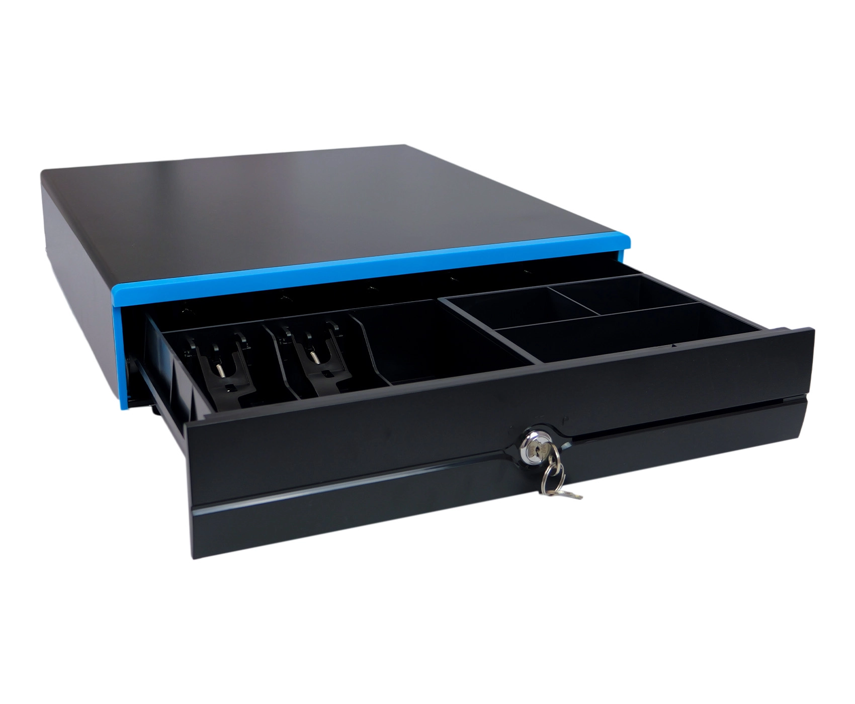 Lekkie i płynne otwieranie szuflada zawdzięcza systemowi przesuwnemu opartemu na wałkach z tworzywa sztucznego, umieszczonych na specjalnych szynach. Akcesorium oferuje współpracę z większością dostępnych na rynku urządzeń fiskalnych, jak kasa, drukarka paragonów czy terminal POS, za sprawą kabla ze złączem RJ12, gdzie napięcie cewki wynosi 6/12V. Dużą zaletą jest możliwość otwarcia urządzenia na trzy sposoby. Otwieranie ręczne możliwe jest za sprawą kluczyka znajdującego się w zestawie. Znajdująca się na spodzie urządzenia dźwignia, pozwala na otwieranie awaryjne. Elektroniczne otwieranie po podłączeniu do urządzenia fiskalnego umożliwia kabel RJ12.