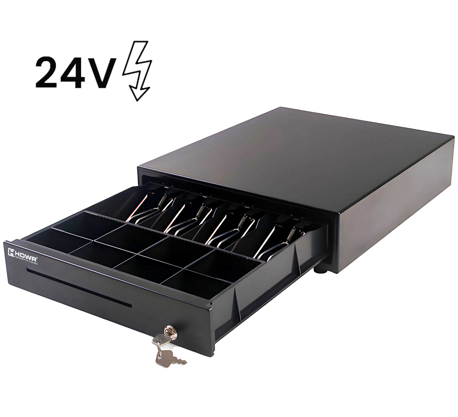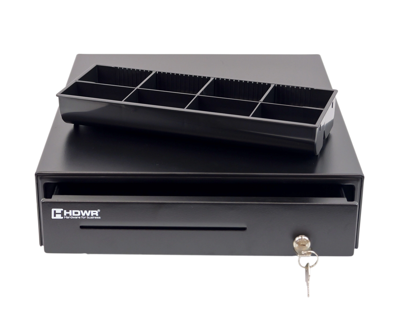 Szuflada kasjerska do kasy fiskalnej z napięciem 24V, 4 przegrody na banknoty i 8 na bilon, stalowa HD-KER35