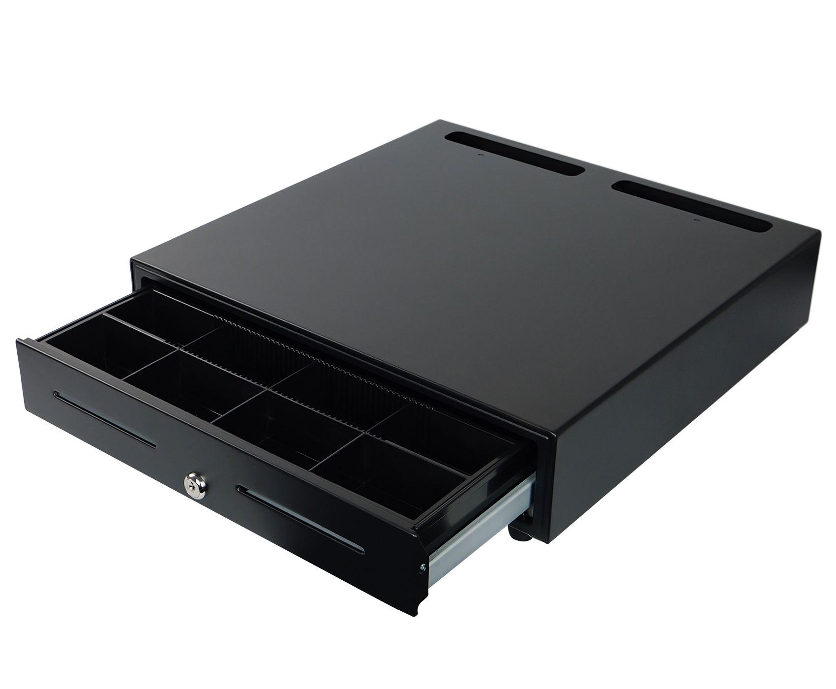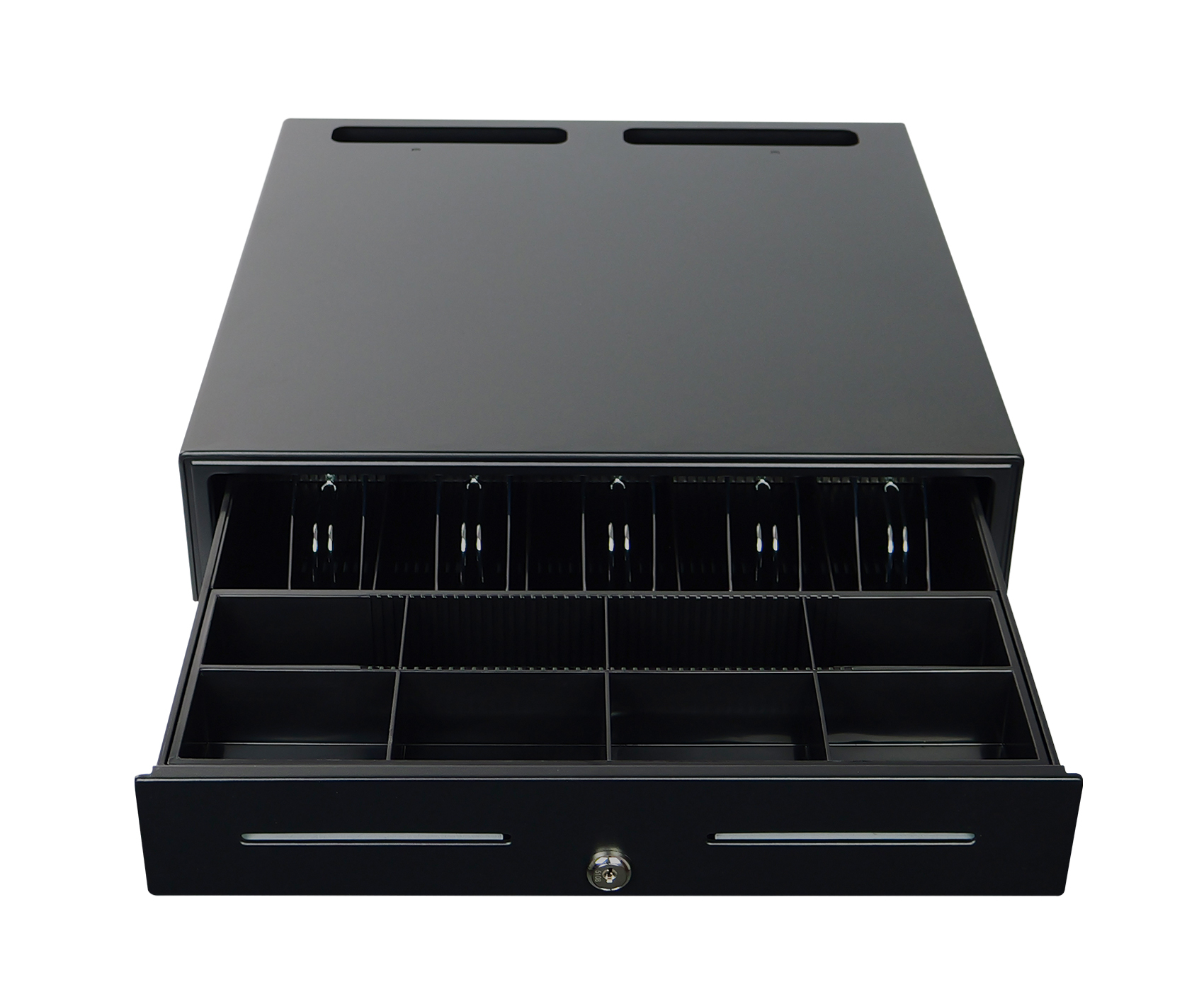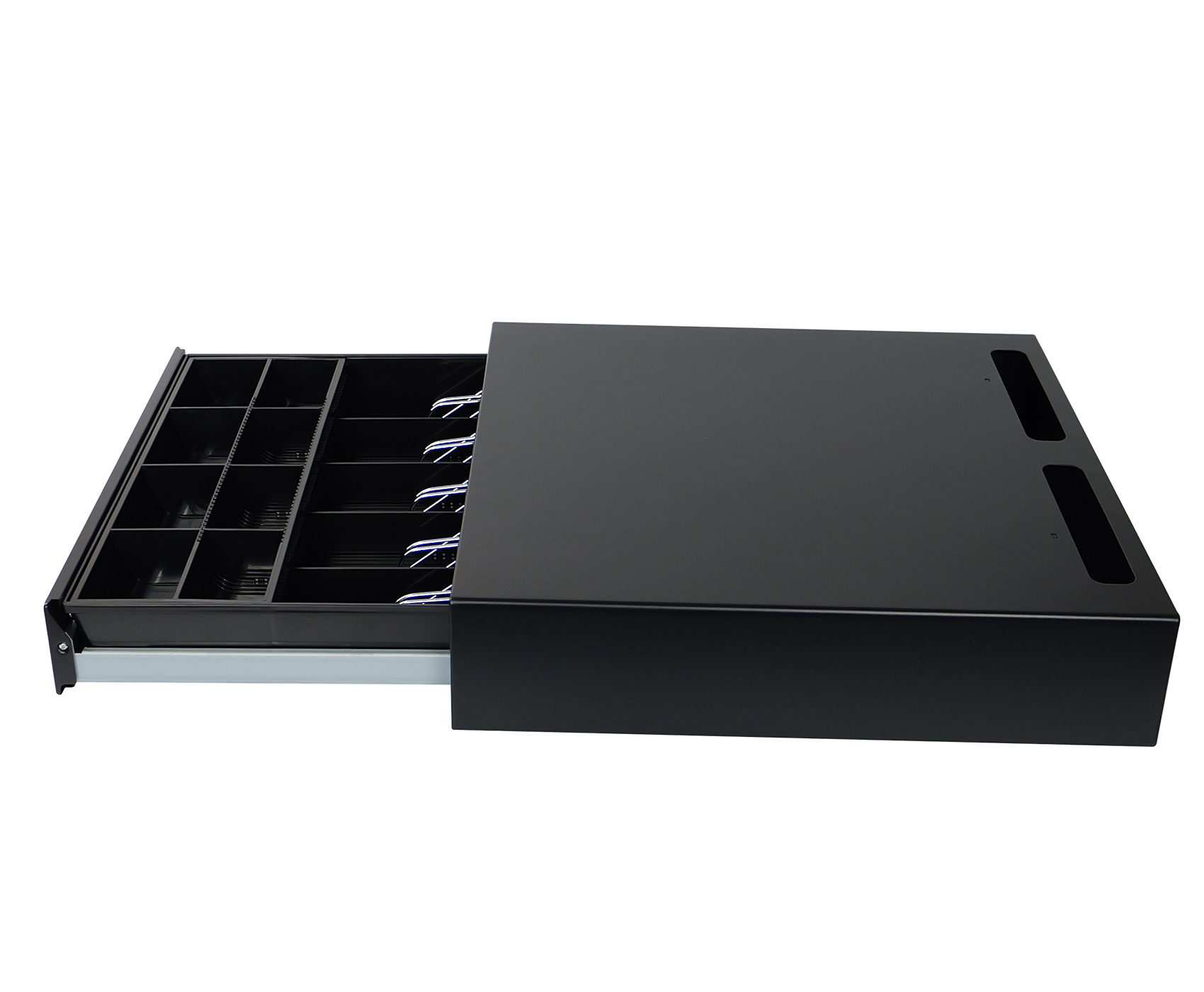 SecureTill-460F została wyposażona w trójpozycyjny zamek z czterema funkcjami, umożliwiający ręczne i elektroniczne otwieranie oraz awaryjne zamknięcie. Dzięki interfejsowi RJ12, szuflada może być podłączona do kas fiskalnych i terminali POS, co pozwala na automatyczne otwieranie po zakończeniu transakcji. Napięcie 12V oraz żywotność do 1 000 000 cykli pracy gwarantują niezawodność i długą eksploatację, a płynny system przesuwny oparty na prowadnicach zapewnia wygodne i ciche działanie w każdych warunkach.