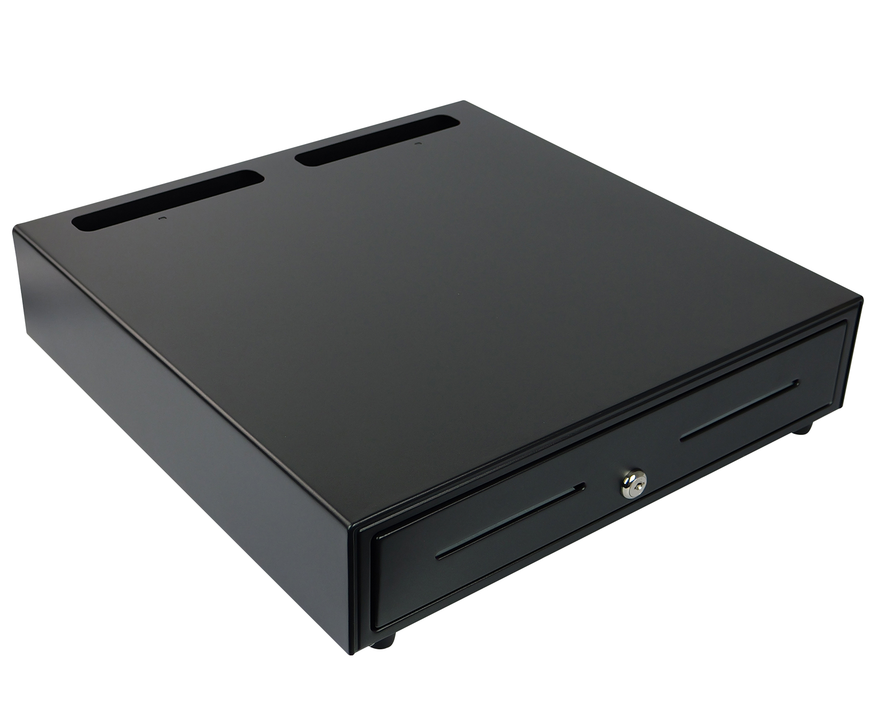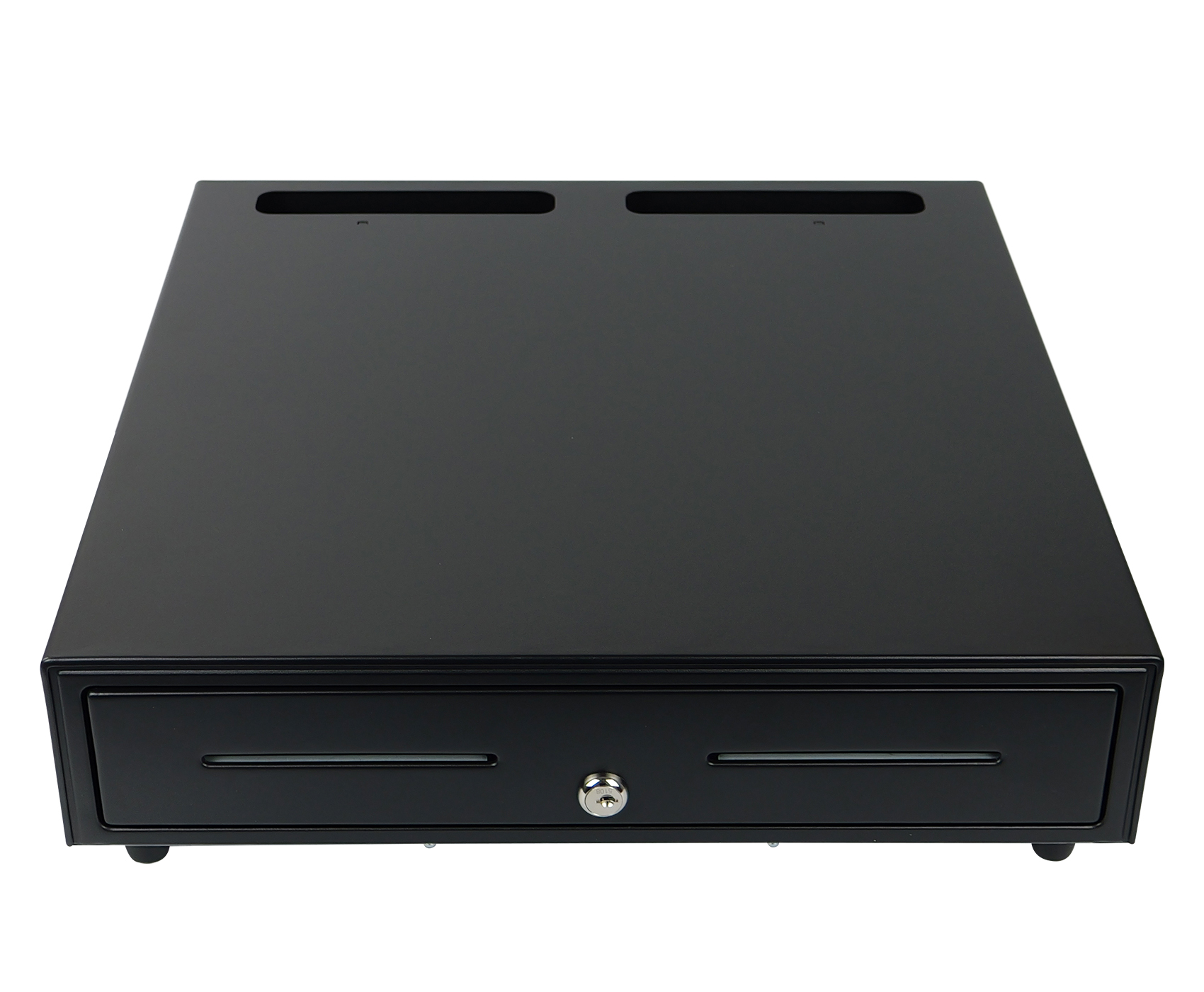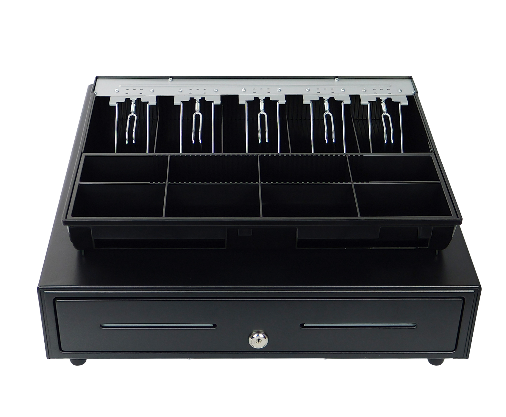 SecureTill-460F została wyposażona w trójpozycyjny zamek z czterema funkcjami, umożliwiający ręczne i elektroniczne otwieranie oraz awaryjne zamknięcie. Dzięki interfejsowi RJ12, szuflada może być podłączona do kas fiskalnych i terminali POS, co pozwala na automatyczne otwieranie po zakończeniu transakcji. Napięcie 12V oraz żywotność do 1 000 000 cykli pracy gwarantują niezawodność i długą eksploatację, a płynny system przesuwny oparty na prowadnicach zapewnia wygodne i ciche działanie w każdych warunkach.