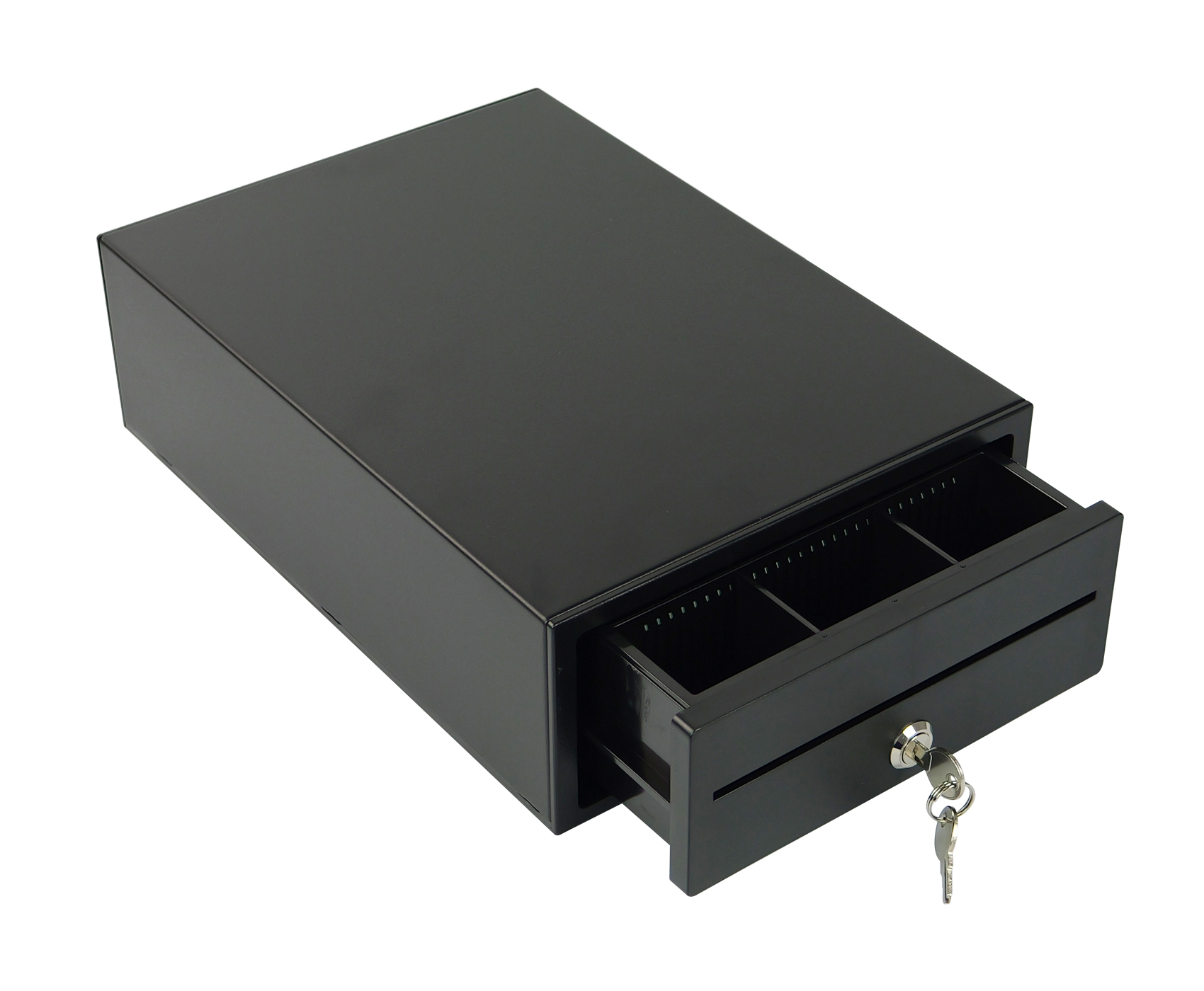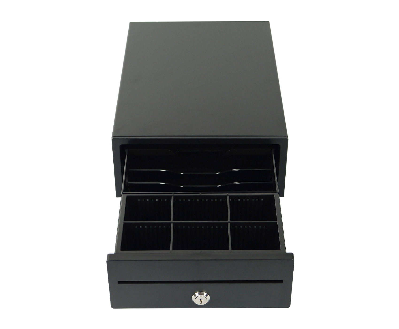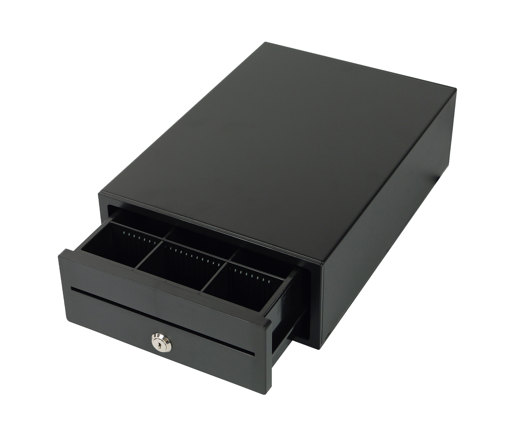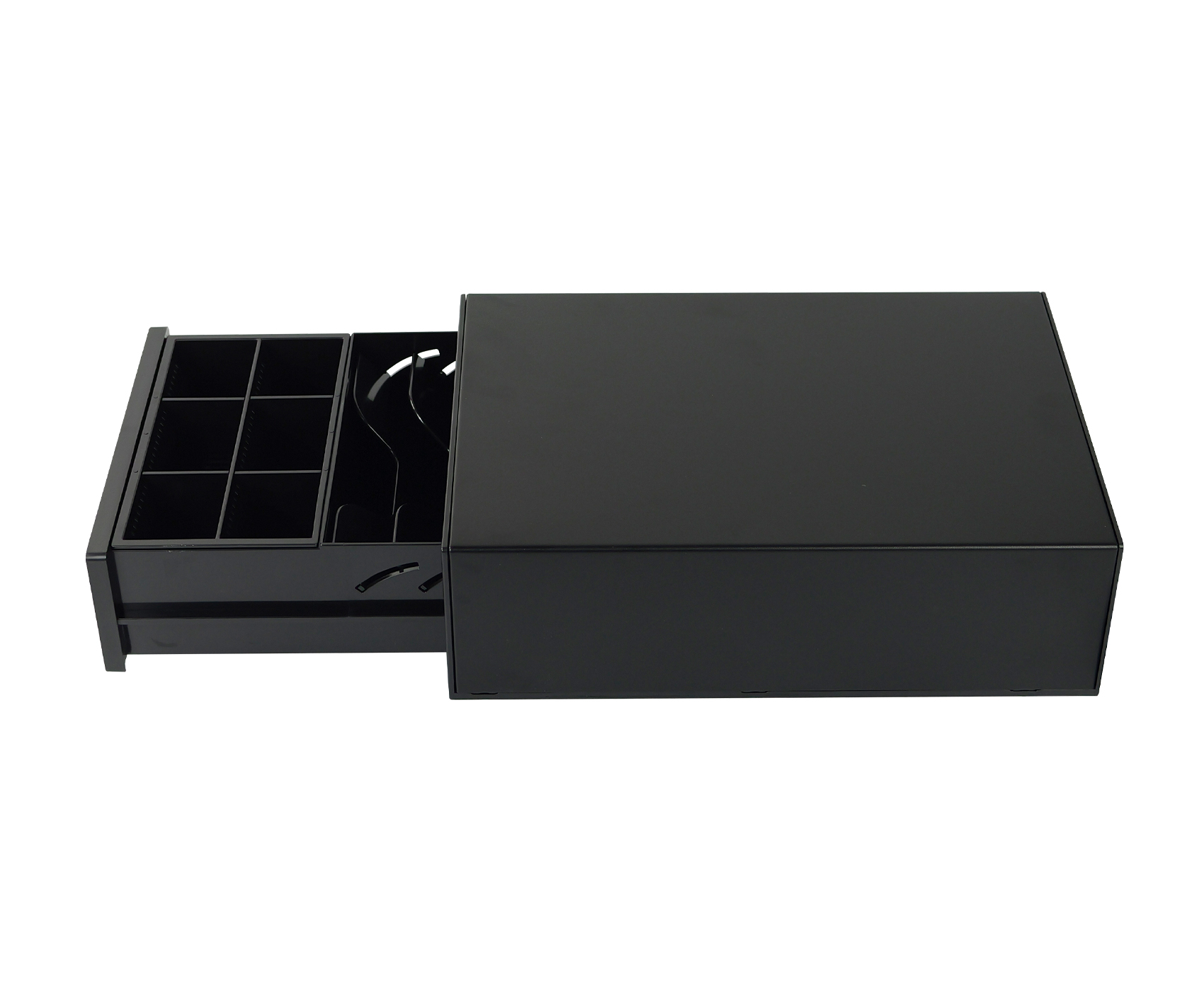 SecureTill-208 obsługuje elektroniczne otwieranie przez interfejs RJ12 (napięcie cewki 12V), dzięki czemu jest kompatybilna z większością kas fiskalnych i systemów POS. Konstrukcja oparta na prowadnicach zapewnia cichy i płynny mechanizm otwierania, a wysoka trwałość mechanizmu – do 1 000 000 cykli pracy – gwarantuje niezawodne działanie przez długi czas. To idealne rozwiązanie dla firm poszukujących niezawodnej i kompaktowej szuflady kasowej.