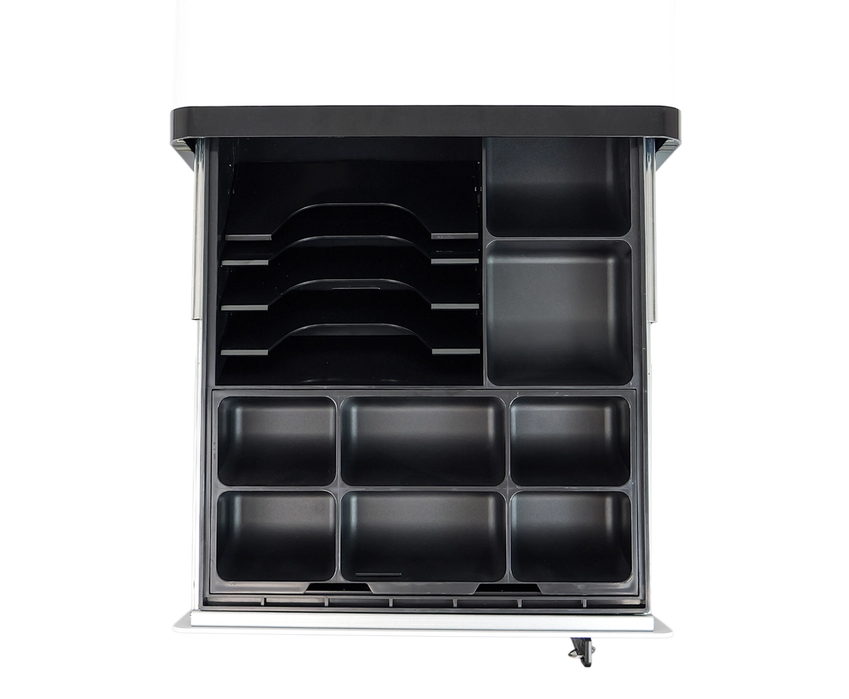 Wewnątrz szuflady znajduje się praktyczny organizer, który oferuje 5 przegród na banknoty oraz 8 na monety. Wkładkę na monety można dodatkowo wyjąć, co umożliwia przechowywanie większych banknotów lub dokumentów pod spodem. Na froncie szuflady umieszczono szczelinę, która pozwala na wsunięcie bonów, czeków czy potwierdzeń płatności bez konieczności otwierania szuflady, co wpływa na wygodę użytkowania.