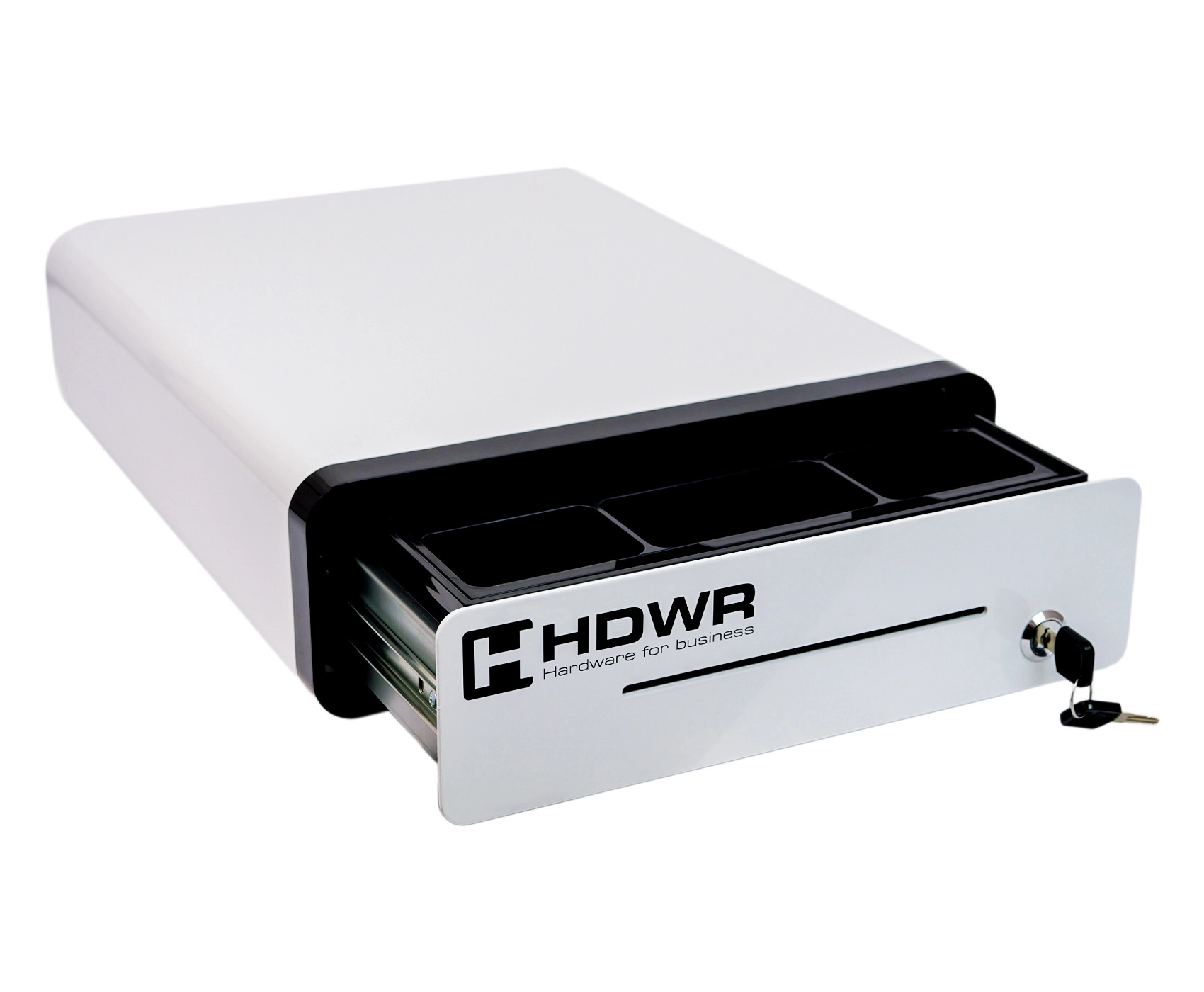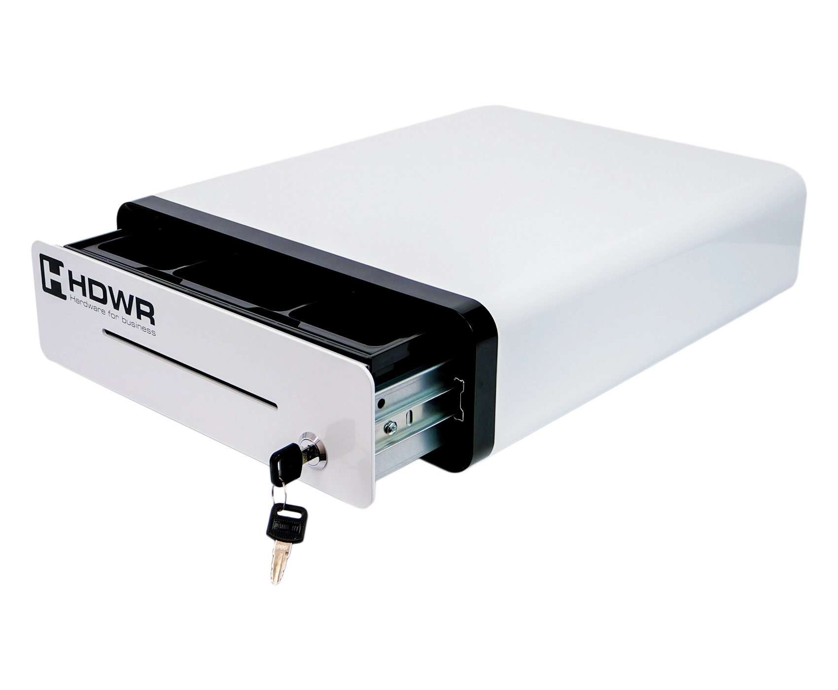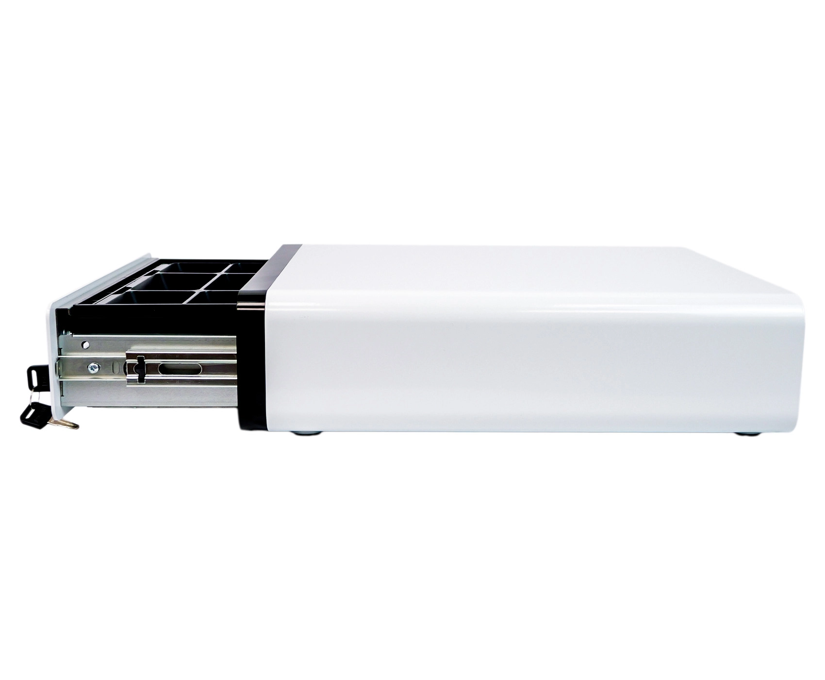 Szuflada kasowa securePRO-303WN to połączenie funkcjonalności i wyjątkowego stylu. Wykonana z wytrzymałego stopu aluminium, gwarantuje trwałość i odporność na uszkodzenia. Cechuje się nietuzinkowym i nowoczesnym designem w białej kolorystyce obudowy z czarnym elementem na froncie, przez co wyróżnia się na tle tradycyjnych modeli. Zaokrąglone krawędzie nadają szufladzie eleganckiego i smukłego wyglądu, dzięki czemu wpasuje się w każde, nawet najbardziej ekskluzywne wnętrze.