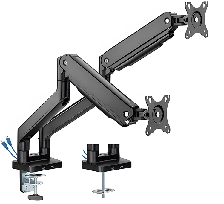 Ramiona uchwytu zostały wyposażone w sprężynę mechaniczną, która zapewnia dokładne i precyzyjne ustawienie monitora. Narzędzie umożliwia obrót ramion o 90 stopni, zachylanie i odchylanie monitorów o 40 stopni. Dodatkowo funkcja tilt pozwala na przechylenie monitorów o 180 stopni, co daje możliwość obrotu ekranu do np. pozycji pionowej. U podstawy uchwytu zostały wbudowane dwa porty USB 3.0, które umożliwią podłączenie urządzeń zewnętrznych do komputera.