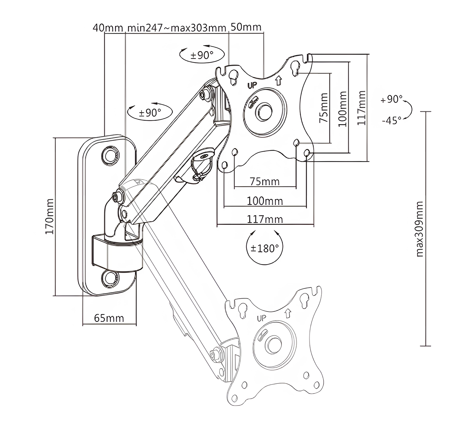- Zakres obrotu ramion: +90° ~ -90°